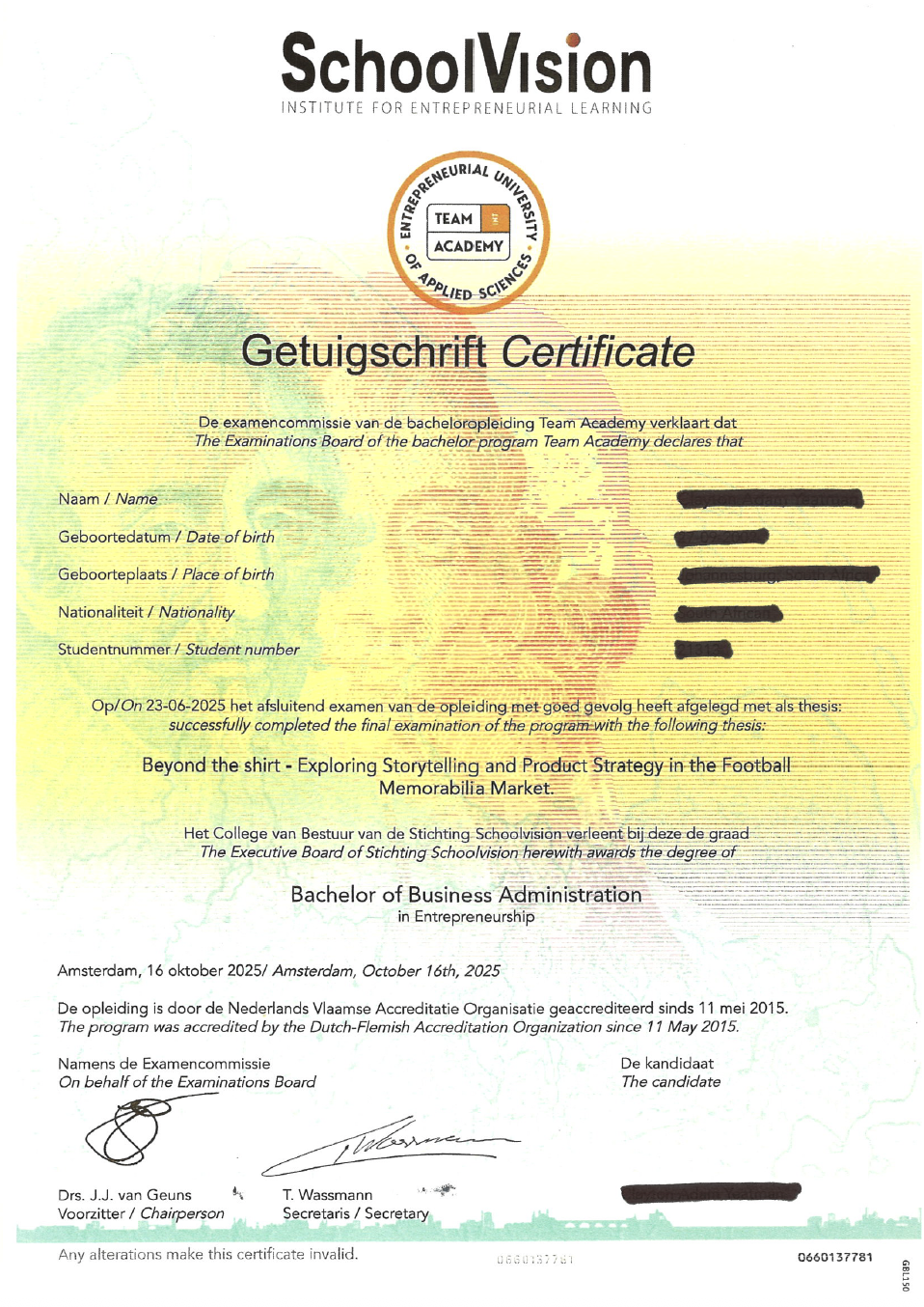 Baigus studijas išduodamas Team Academy ir Amsterdam Tech aukštosios mokyklos diplomas.